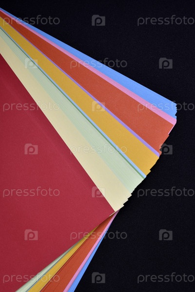 Разноцветные листы бумаги на черном фоне. Цветная офисная бумага. Пачка цветной бумаги
