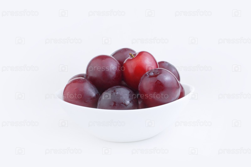 Свежие синие красные сливы в белой тарелке на белом фоне. Урожай слив или рецепт слив. Копировать пространство