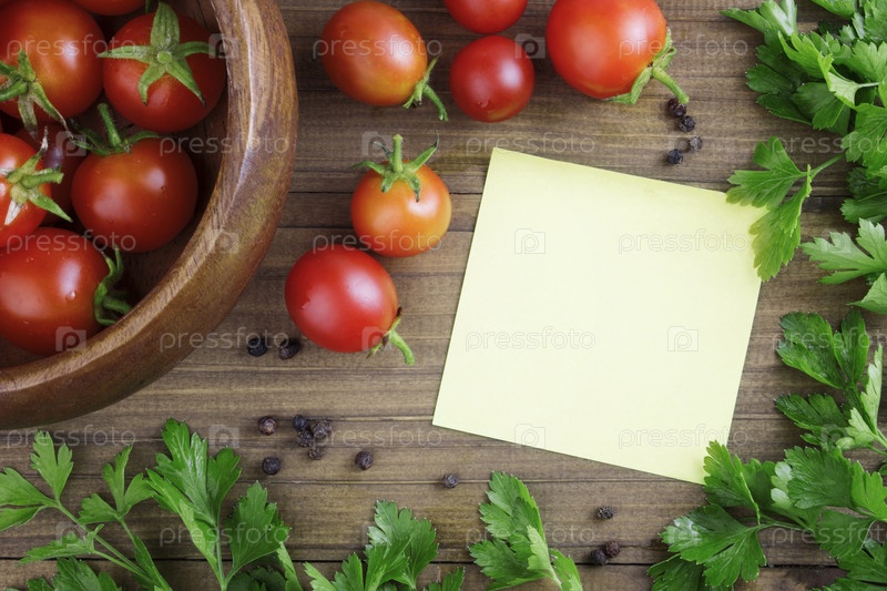 Помидоры черри на деревянном фоне с петрушкой, специями и блокнотом для написания рецепта. Концепция рецептов с помидорами, консервирование. Копировать пространство