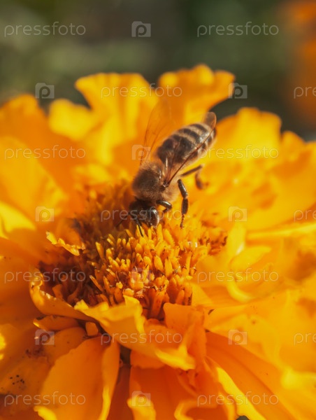 Медоносная пчела собирает нектар в бархатцах. Выборочный фокус. Вертикальная ориентация