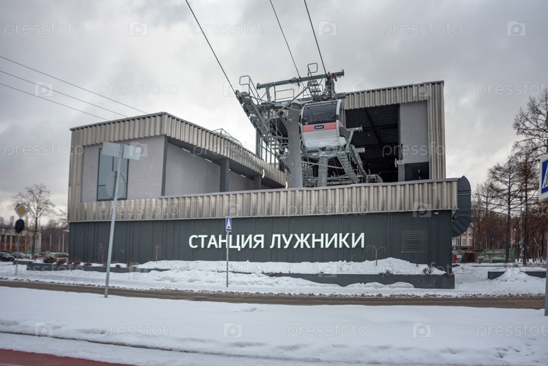 Москва, Россия - 30 января 2021 г.: Станция "Лужники" канатной дороги "Воробьевы горы" через Москву-реку и кабинки с пассажирами