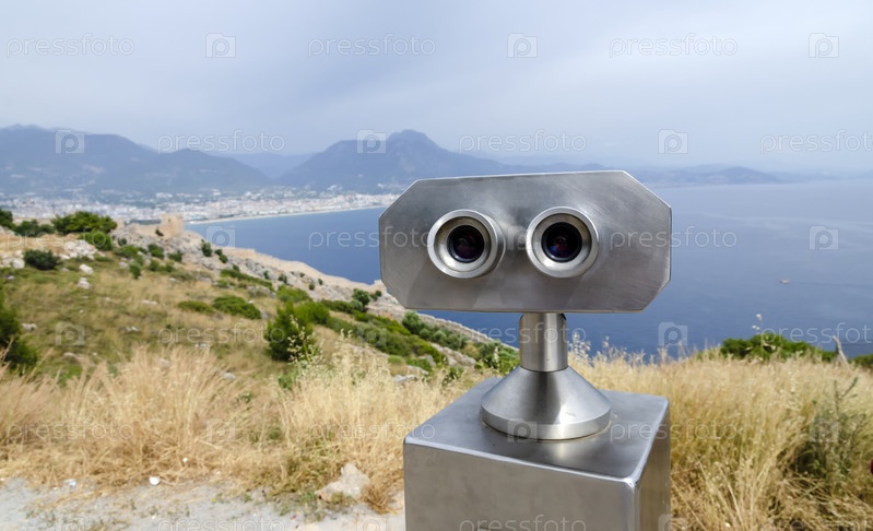 Монетный бинокль рядом с набережной в Анталии с видом на залив и город