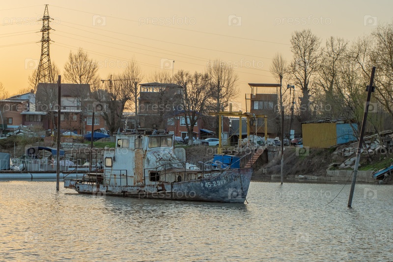Старая ржавая лодка стоит на якоре на лодочной станции