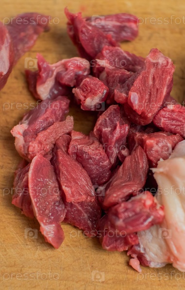 На разделочной доске говядина нарезана на кусочки