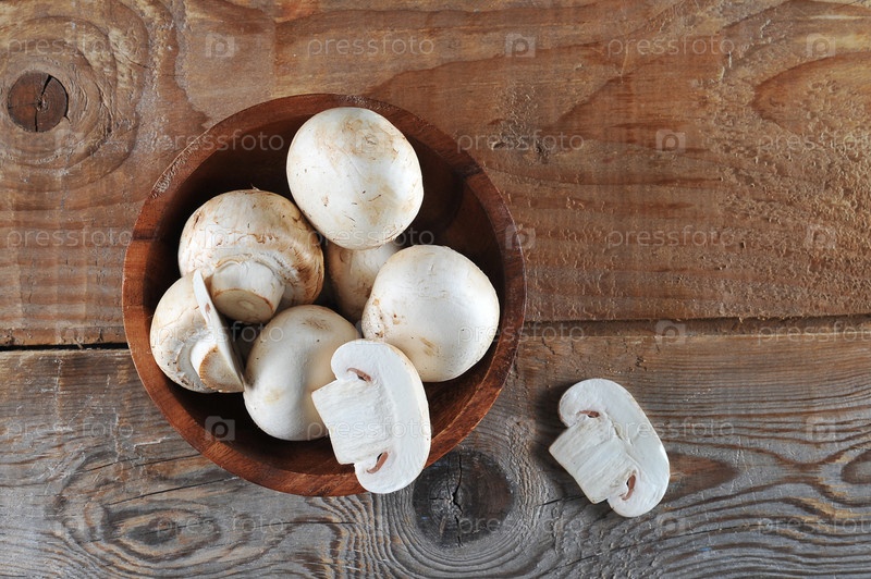 Шампиньоны свежие белые грибы в коричневой миске