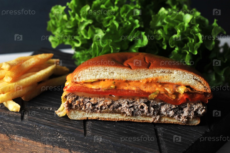 Гамбургер фаст-фуд, приготовленный дома на деревянной доске
