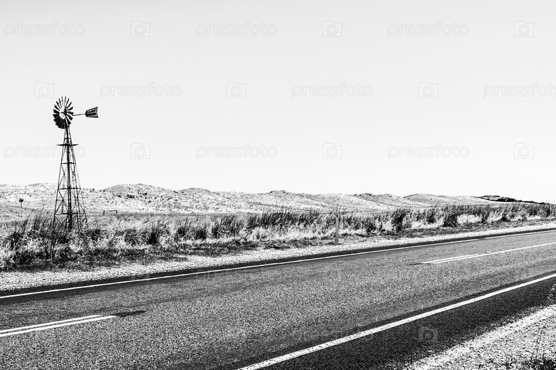 Ветряная мельница возле пустой асфальтовой дороги через австралийскую глубинку. Северная Австралия