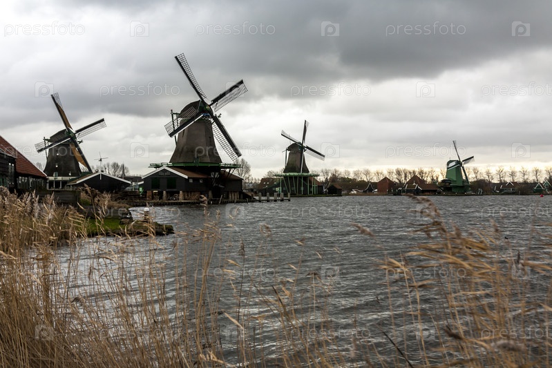 Ветряные мельницы в деревне Заансе Сханс в пасмурный осенний день, Нидерланды