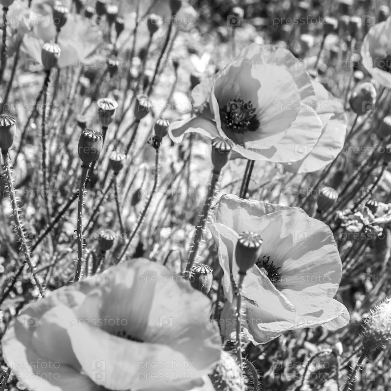 Поле цветов мака летом, черно-белое изображение. Выборочный фокус