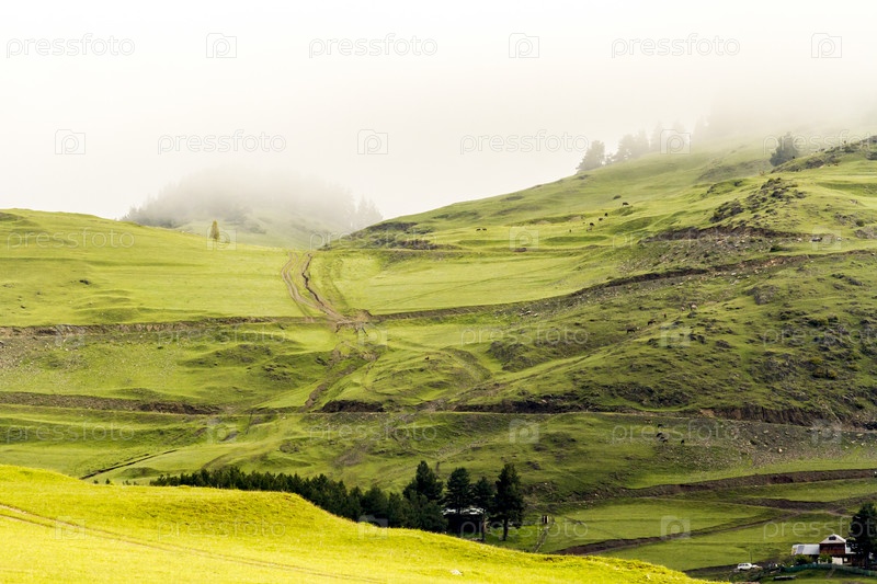 Зеленая долина туманным утром в горах Кавказа. Грузия, Тушети