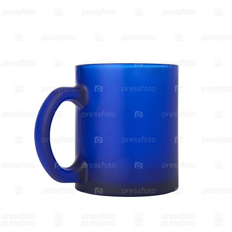 Большая стеклянная кружка синего матового стекла крупным планом на белом фоне