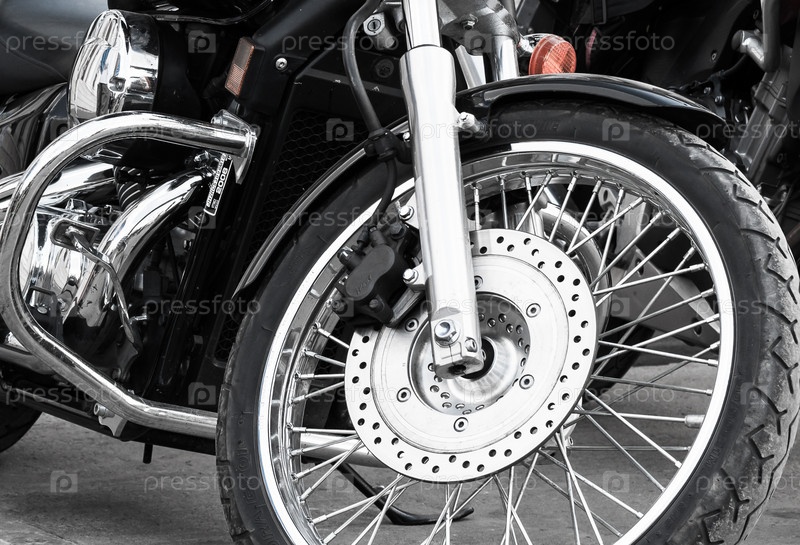 Фото крупным планом переднего колеса мотоцикла. спицы колеса мотоцикла. мотоцикл в стиле "чоппер", стиль мото США. Хромированные детали мотоциклов. фотография переднего колеса мотоцикла раскрывается. спицы колеса мотоцикла. мотоцикл в стилистике