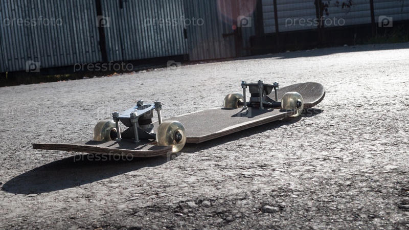 Старый скейтборд с заниженным коньком, стилистическая переработка оригинального скейтборда. потрепанный скейтборд. старый скейтборд с заниженной доской, стилистическая переработка оригинального скейтборда. потрепанная доска для катания