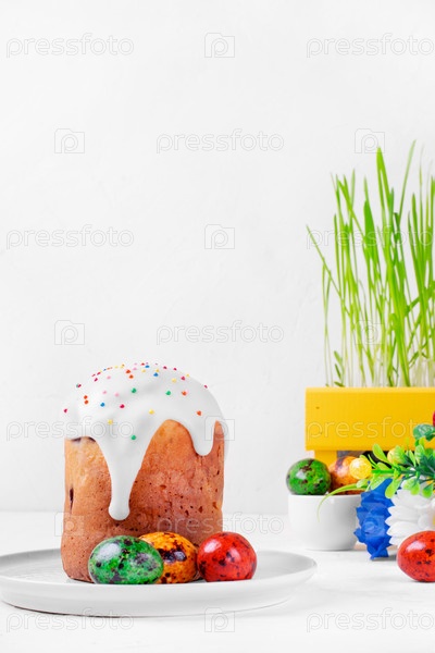 Пасхальная композиция на белом столе. Пасхальный кулич с сахарной глазурью, цветными карамельными яйцами, цветами и проросшей травой в желтой коробке. Копировать пространство