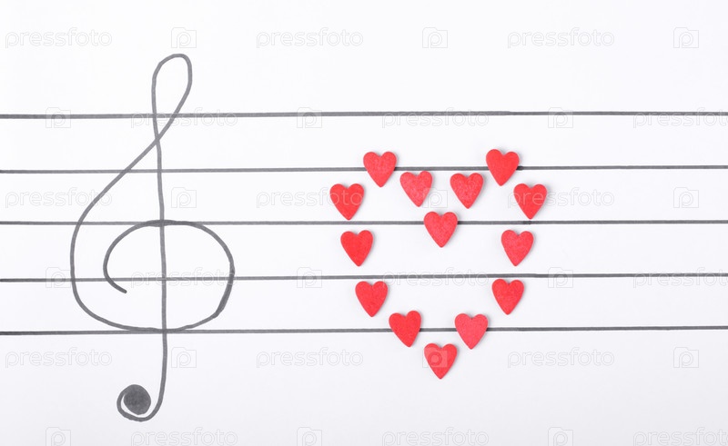 Сахарные сердечки делают сердце на нотном стане со скрипичным ключом. Музыкальный фон Валентина. Креативная композиция