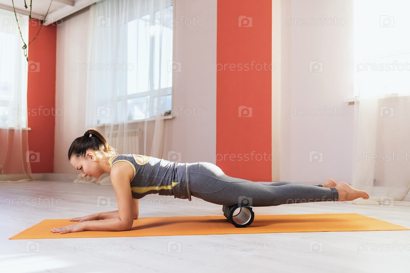 Женщина в спортивной одежде выполняет миофасциальный массаж мышц бедра роликом на коврике в спортзале