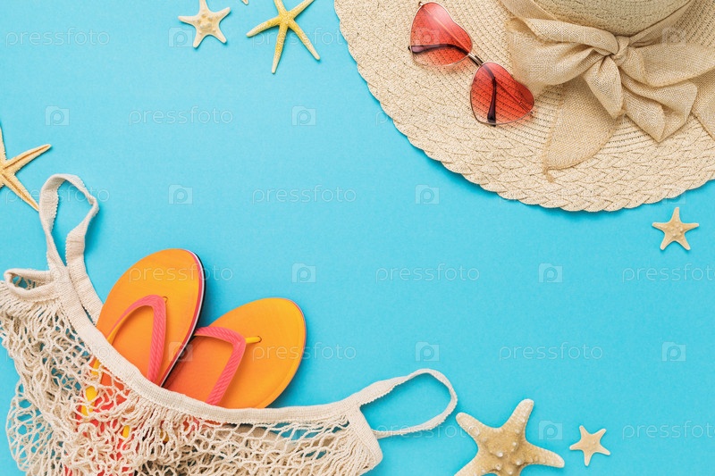 Шляпа, солнцезащитные очки, пляжные тапочки в сумке и морские звезды на синем фоне с местом для текста