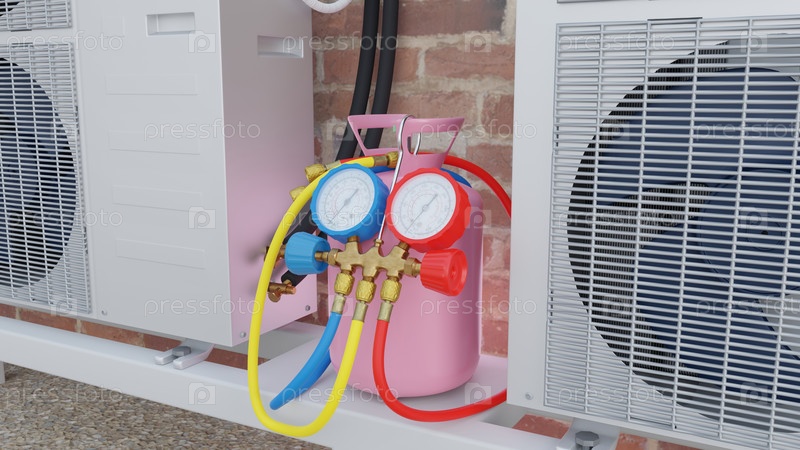 Газовый баллон, манометры и наружный блок кондиционера на крыше 3d