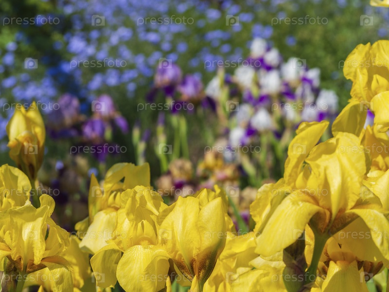 Красивый пейзаж цветущего весеннего сада, цветочная рамка из желтых цветов ириса. Разноцветные ирисы на клумбе среди сочной зелени