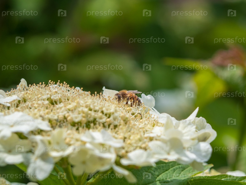 Пчела в пыльце на белых цветках - макросъемка. Медоносная пчела опыляет цветки цветущей калины крупным планом