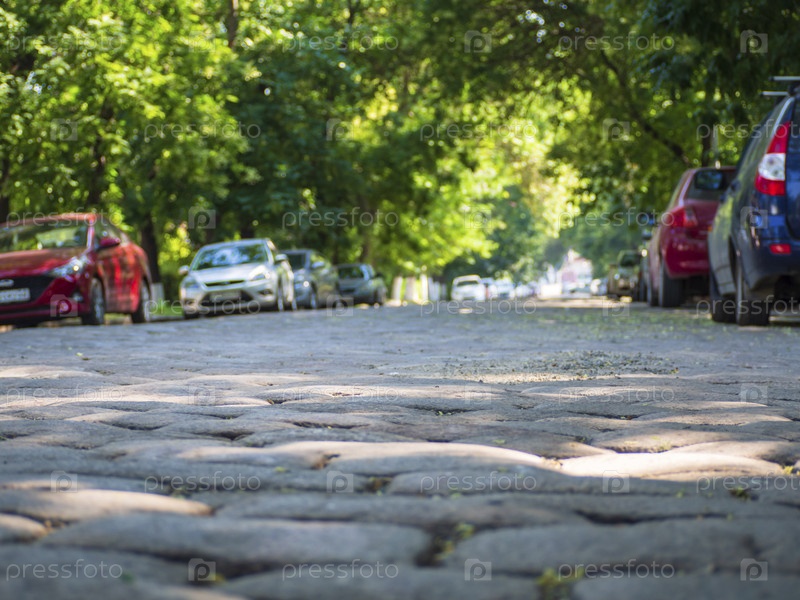 Вид на городскую улицу, покрытую булыжником и припаркованные автомобили в тени деревьев. Старая мощеная улица в солнечный летний день — естественный рисунок теней придает улице приятную глубину