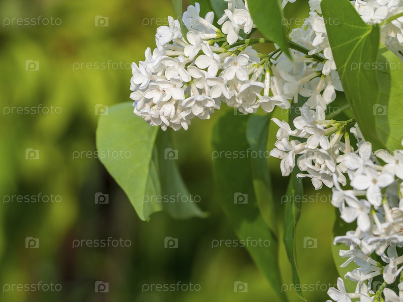Цветущая ветка сирени с элегантными белыми цветами на фоне зеленого сада. Красивые белые сиреневые цветы с зеленым фоном. Элегантный художественный образ натуры. Формат баннера, пространство для копирования