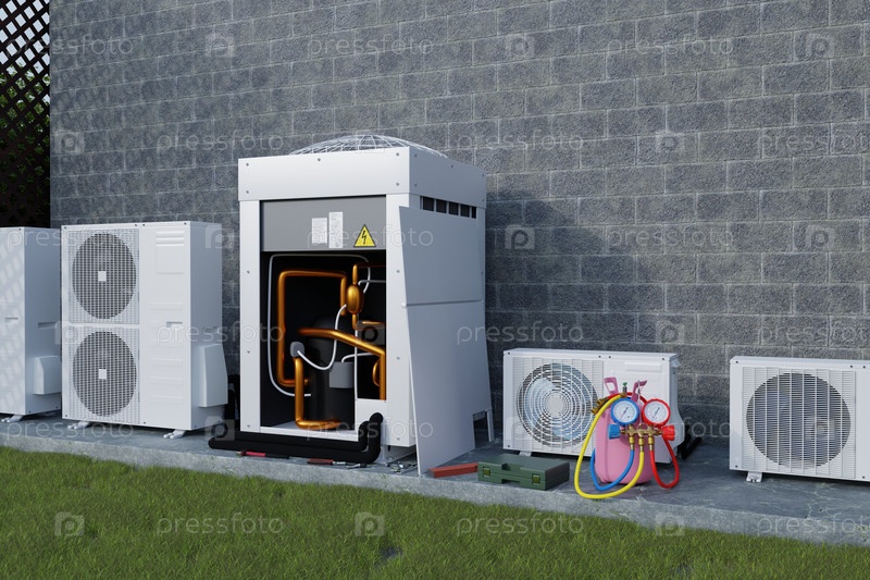 Несколько различных кондиционеров на заднем дворе с датчиками и инструментами 3d