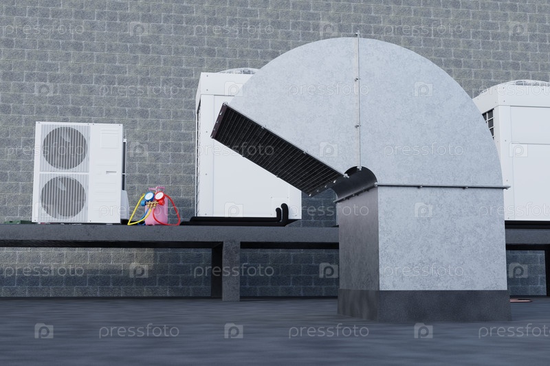 Вентиляционная коробка на крыше с кондиционерами и инструментами 3d