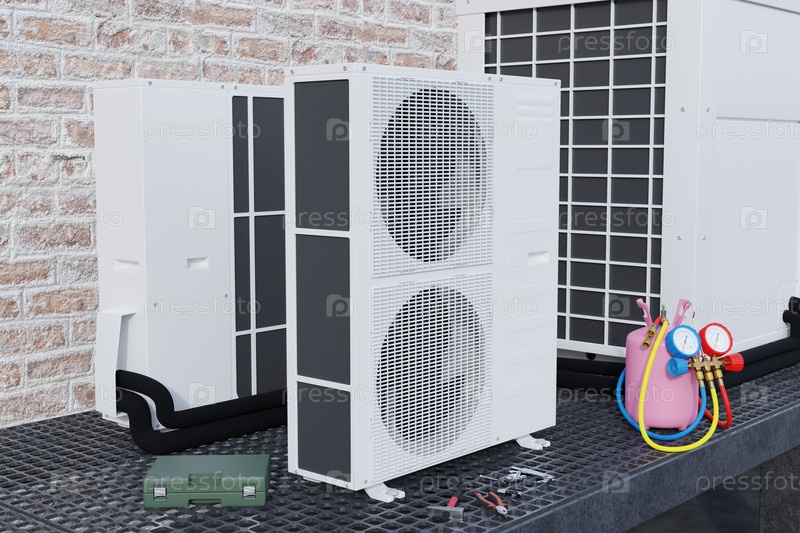 Двухвентиляторные кондиционеры на крыше на фоне кирпичной стены 3d