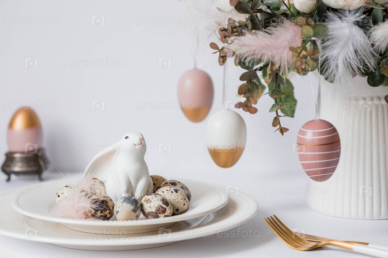 Баннер. Концепция светлого праздника Пасхи. Букет цветов с перьями, белыми кроликами и пасхальными яйцами в тарелке на белом изолированном фоне. Красивая пасхальная открытка