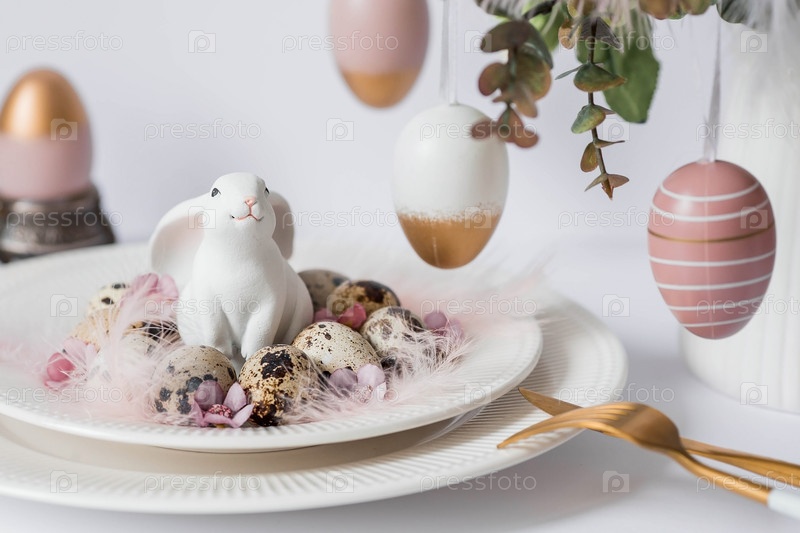 Баннер. Концепция светлого праздника Пасхи. Букет цветов с перьями, белыми кроликами и пасхальными яйцами в тарелке на белом изолированном фоне. Красивая пасхальная открытка