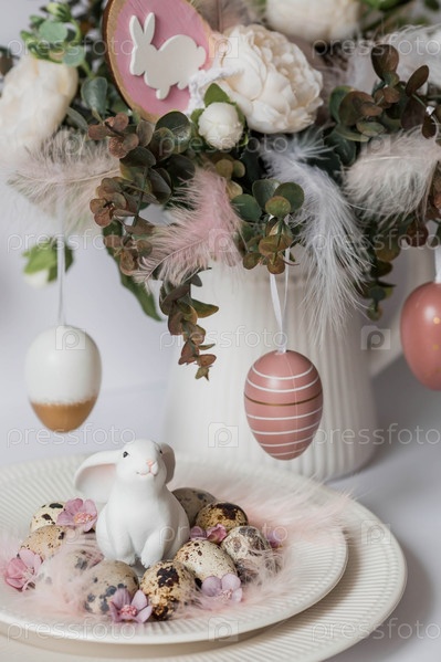 Баннер. Концепция светлого праздника Пасхи. Букет цветов с перьями, белыми кроликами и пасхальными яйцами в тарелке на белом изолированном фоне. Красивая пасхальная открытка