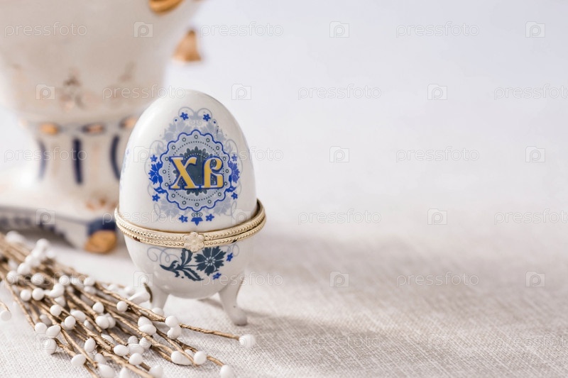 Большая яичная коробка с надписью XB и верба на льняной салфетке на столе.Концепция светлого праздника Пасхи и Вербного воскресенья