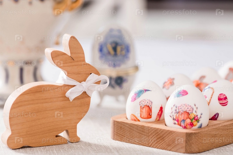 Большая яичная коробка с надписью XB, пасхальный кролик и пасхальные яйца на льняной салфетке на столе