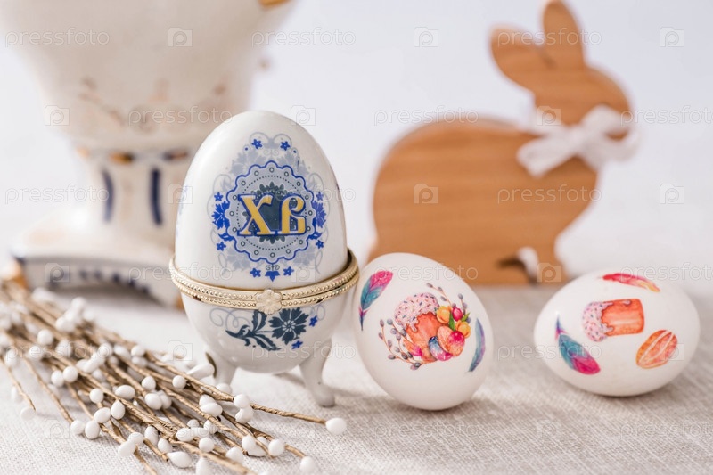 Большая яичная коробка с надписью XB, пасхальный кролик и пасхальные яйца на льняной салфетке на столе