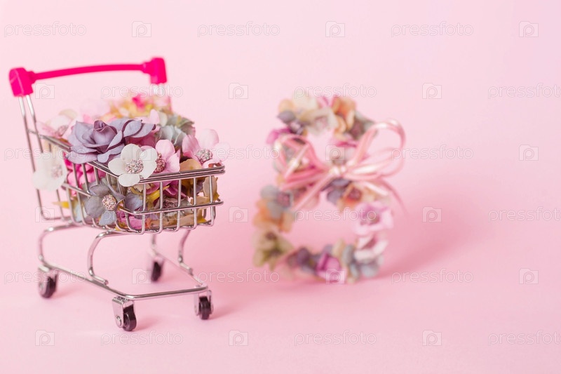 Международный женский день. Баннер, флаер, красивая открытка на 8 марта. Цветы в форме цифры восемь и продуктовая тележка на розовом фоне. Покупка цветка к 8 марта