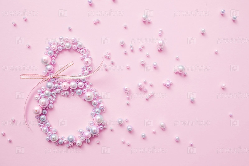 Международный женский день. Баннер, флаер, красивая открытка на 8 марта. Жемчуг в форме цифры восемь на розовом фоне