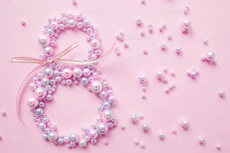 Международный женский день. Баннер, флаер, красивая открытка на 8 марта. Жемчуг в форме цифры восемь на розовом фоне