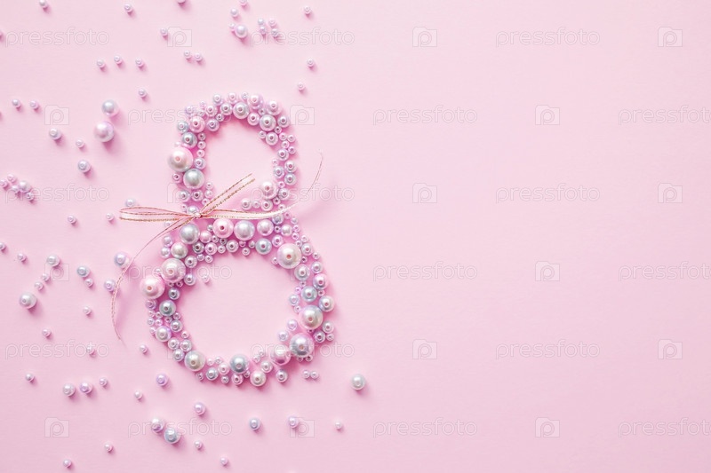 Международный женский день. Баннер, флаер, красивая открытка на 8 марта. Жемчуг в форме цифры восемь на розовом фоне