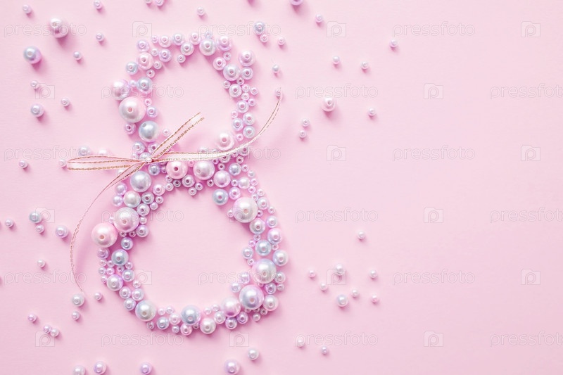 Международный женский день. Баннер, флаер, красивая открытка на 8 марта. Жемчуг в форме цифры восемь на розовом фоне