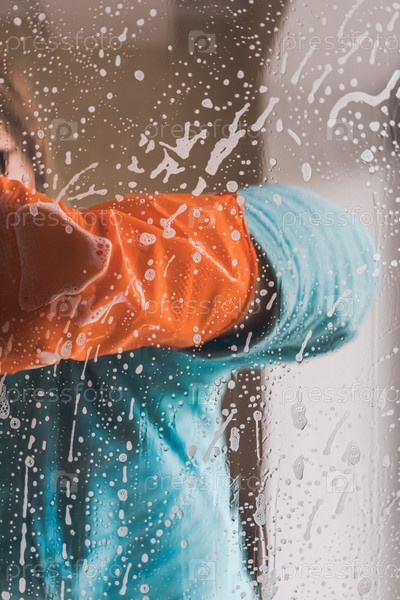 Женщина в синей одежде и оранжевой перчатке натирает оконное стекло мыльной пеной