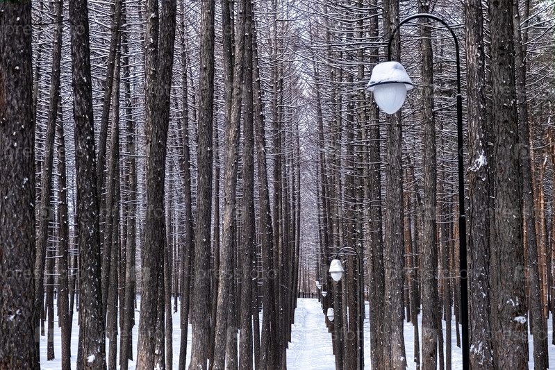 Фон. Лес темных лиственниц в парке с фонарями. Фото высокого качества