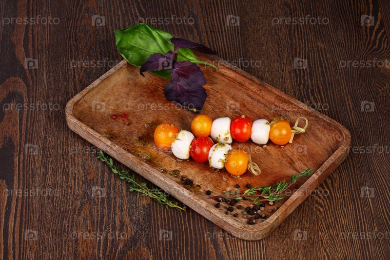 Шашлык из моцареллы и томатов черри на деревянном фоне