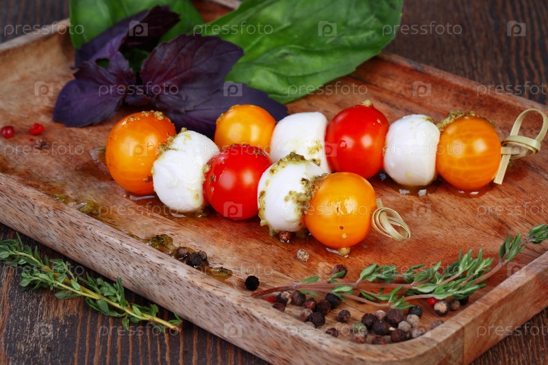 Шашлык из моцареллы и томатов черри на деревянном фоне