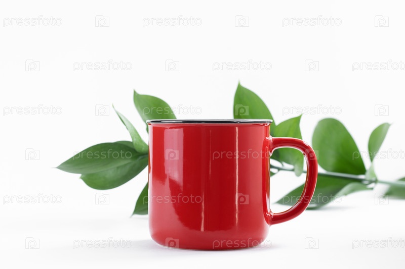 Красная кружка с ручкой, изолированные на белом фоне с листьями