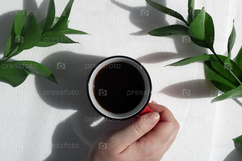 Рука держит свежий утренний кофе в красной кружке, на белом столе с зелеными листьями, с жесткими тенями. Концепция кофе или завтрака