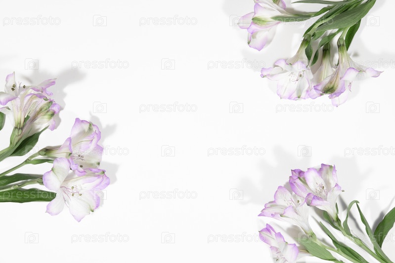 Подиум из бетона с розовыми цветами клематиса, для презентации упаковки и косметики, вид сверху, на белом фоне. Дисплей продукта с белой бетонной текстурой, каменной текстурой