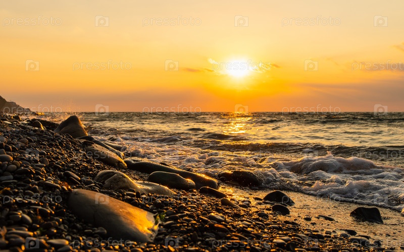 Скалистый берег на фоне заката. Золотой закат на берегу моря и пенящееся море. Выборочный фокус. Сосредоточьтесь на камнях у кромки воды