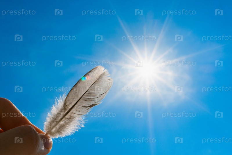 Маленькое голубиное перо в руках на фоне яркого солнца