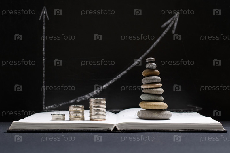 Стопка монет и башня из камешков на фоне графика роста прибыли. Концепция инвестиций в недвижимость